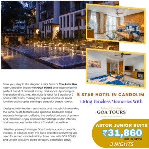 Discover the charm of Goa with GOA TOURS, offering expertly curated holiday packages with stays at luxurious 4 and 5-star hotels and resorts across North and South Goa. Whether you’re planning a romantic escape, a family vacation, a group adventure, or a solo retreat, our packages are tailored to meet diverse travel preferences with the highest standards of comfort and service.